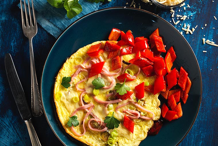 Para la guarnición, lavar y quitar las semillas a los morrones, cortarlos en cuadrados de 2 cm. y saltearlo varios minutos hasta que comiencen a ablandarse en una sartén con el Aceite de Oliva Clásico Natura. Salpimentar a gusto y retirar. Servir un omelette en cada plato acompañado por los morrones salteados.