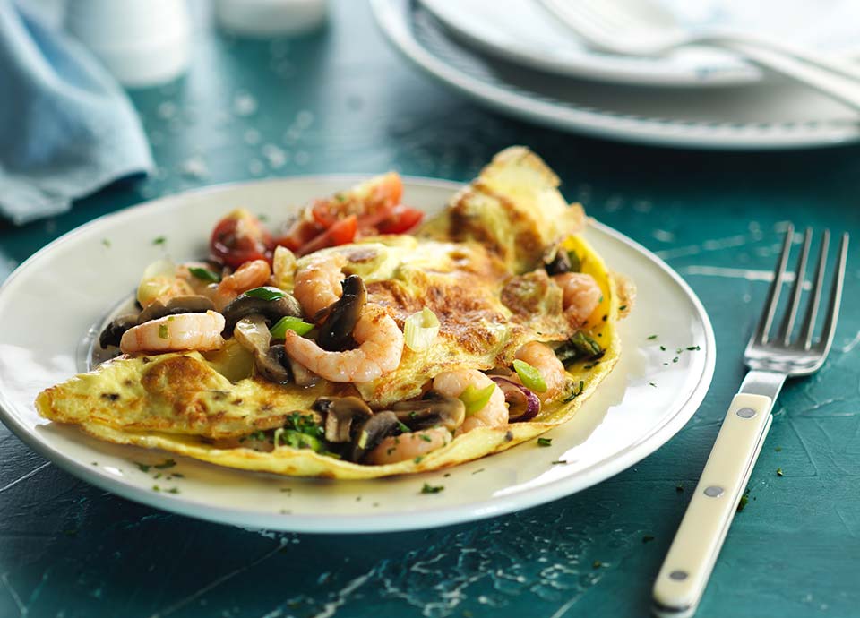 Partir los huevos en un bowl, salpimentar a gusto, agregar la crema (o leche) y batir con un tenedor hasta homogenizar los ingredientes. Calentar una panquequera o sartén pequeña lubricada con abundante Rocío Vegetal Natura y agregar los huevos batidos cubriendo bien toda la superficie. Mantener el fuego fuerte y con la ayuda de una espátula levantar de a ratos los bordes, para que el huevo se escurra en forma pareja. Cocinar aproximadamente durante 2-3 minutos. Antes de que la superficie se seque completamente distribuir el relleno reservado sobre la mitad del omelette. Cubrir el relleno con la parte libre en forma de empanada. Servirlo decorando con el salteado de camarones reservado para este fin.