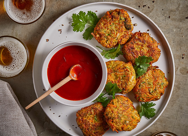 Servir las pakoras en una fuente acompañadas de la salsa de ketchup.