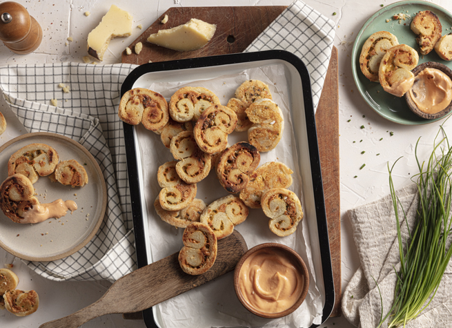 Volcarla sobre la mesada enharinada y trabajar con las manos hasta obtener un bollo liso y homogéneo. Con ayuda de un palote estirar buscando una forma rectangular, distribuir por encima el queso en hebras y la ciboulette. Comenzar a enrollar desde ambos laterales hacia el centro, cortar las palmeritas de un 1- 1,5 cm. de espesor. Disponerlas sobre una placa lubricada con abundante Rocío Vegetal Oliva Natura, batir ligeramente el huevo y pincelarlas.