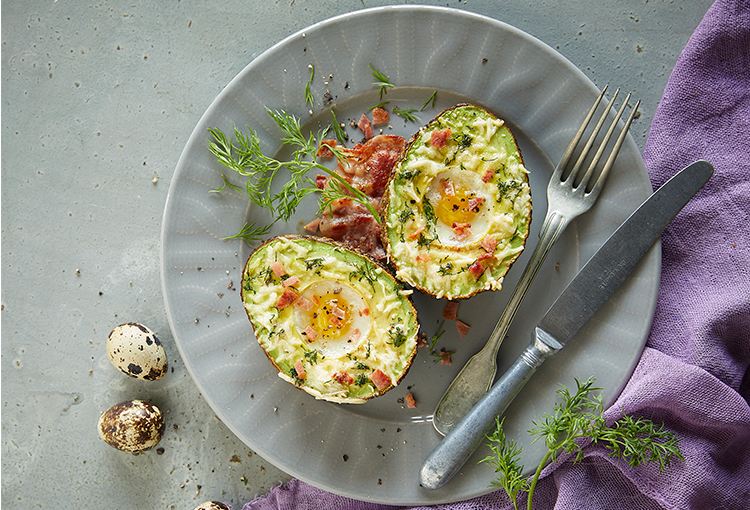 Lavar y cortar al medio las paltas. Retirar el carozo y las partes residuales del carozo que hayan podido quedar. Disponerlas sobre una placa lubricada con Rocío Vegetal Oliva Natura. Cascar un huevo y disponerlo en la parte ahuecada de una mitad de palta. Repetir esta operación con todos los huevos. Salpimentar a gusto. Espolvorear sobre cada mitad un poco de queso rallado y de eneldo fresco picado. Llevar a horno precalentado durante unos 15-20 minutos aproximadamente o hasta la completa cocción del huevo. Retirar, servir dos mitades por porción, decorando los platos con panceta crocante.