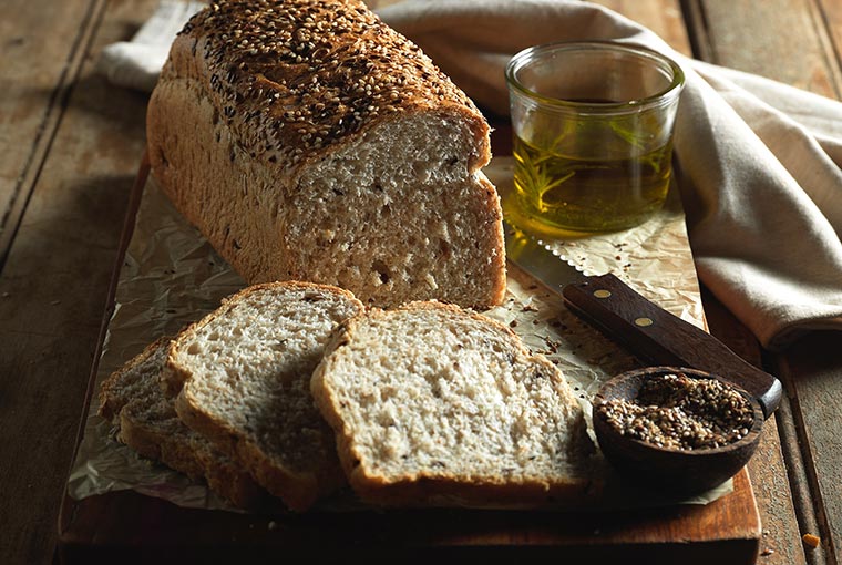 Pincelar el pan con la clara de huevo y espolvorear sobre la superficie las semillas de sésamo o lino.