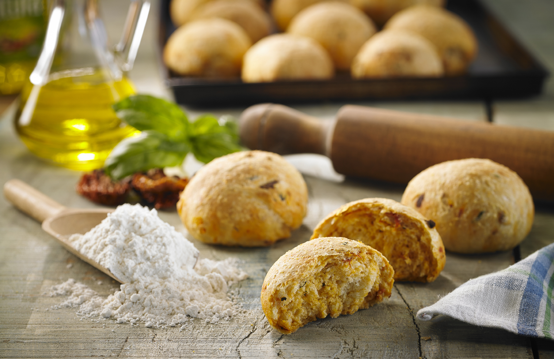 Retirar la masa del bowl, trabajarla agregando la harina necesaria para que no se pegue. Incorporar los tomates, macerados con 4 cucharadas del Aceite de Oliva Natura Intenso y la albahaca picada. Trabajar 5 minutos más, hasta que queden bien distribuidos.