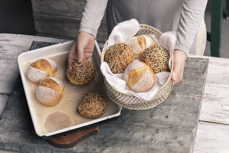 Volver a bollar y colocar en una placa para el horno, espolvorear con harina o pintar con huevo batido y espolvorear con semillas de sésamo. Dejar leudar nuevamente y si se desea realizar un corte en la parte superior. Cocinar en horno precalentado a temperatura fuerte (200°C) durante 15 a 20 minutos.