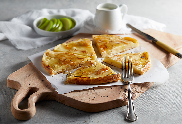 Aparte, lubricar una panquequera o sartén con Rocío Vegetal Natura, verter un cucharón generoso de mezcla cubriendo toda la base, cuando comience a coagular, colocar las manzanas reservadas por sobre el panqueque, cubrir nuevamente con otro cucharón de mezcla y cocinar tapado. Una vez que esté ligado y despegado de los bordes, darlo vuelta con la ayuda de otro plato y deslizarlo nuevamente en la sartén para que dore. Servirlo rociado con el jugo de cocción de las manzanas restante. Repetir la operación hasta terminar la mezcla sirviendo en platos individuales.