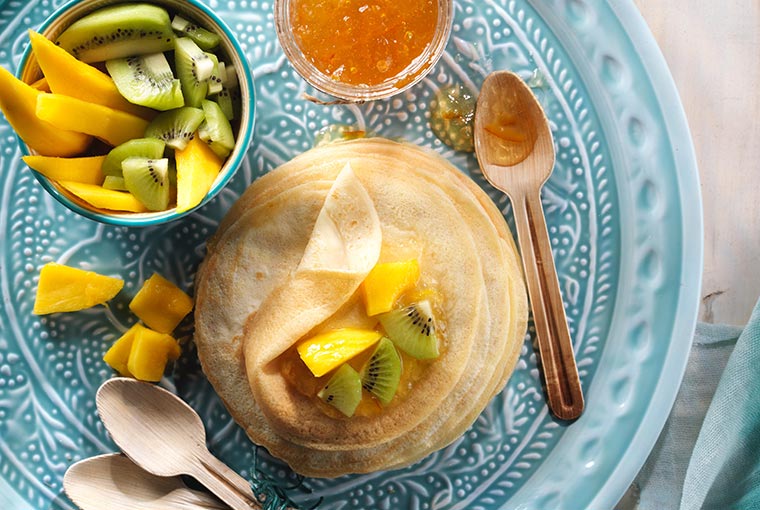 Pelar y cortar las frutas en finas láminas. Colocar cada panqueque sobre un plato, untarlo con la mermelada y disponer la fruta alternadamente, doblarlo al medio y espolvorearlo con azúcar impalpable sugar free.
