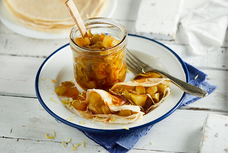 Dorar con manteca los gajos de manzana y agregarles jugo de limón, ralladura y azúcar.
