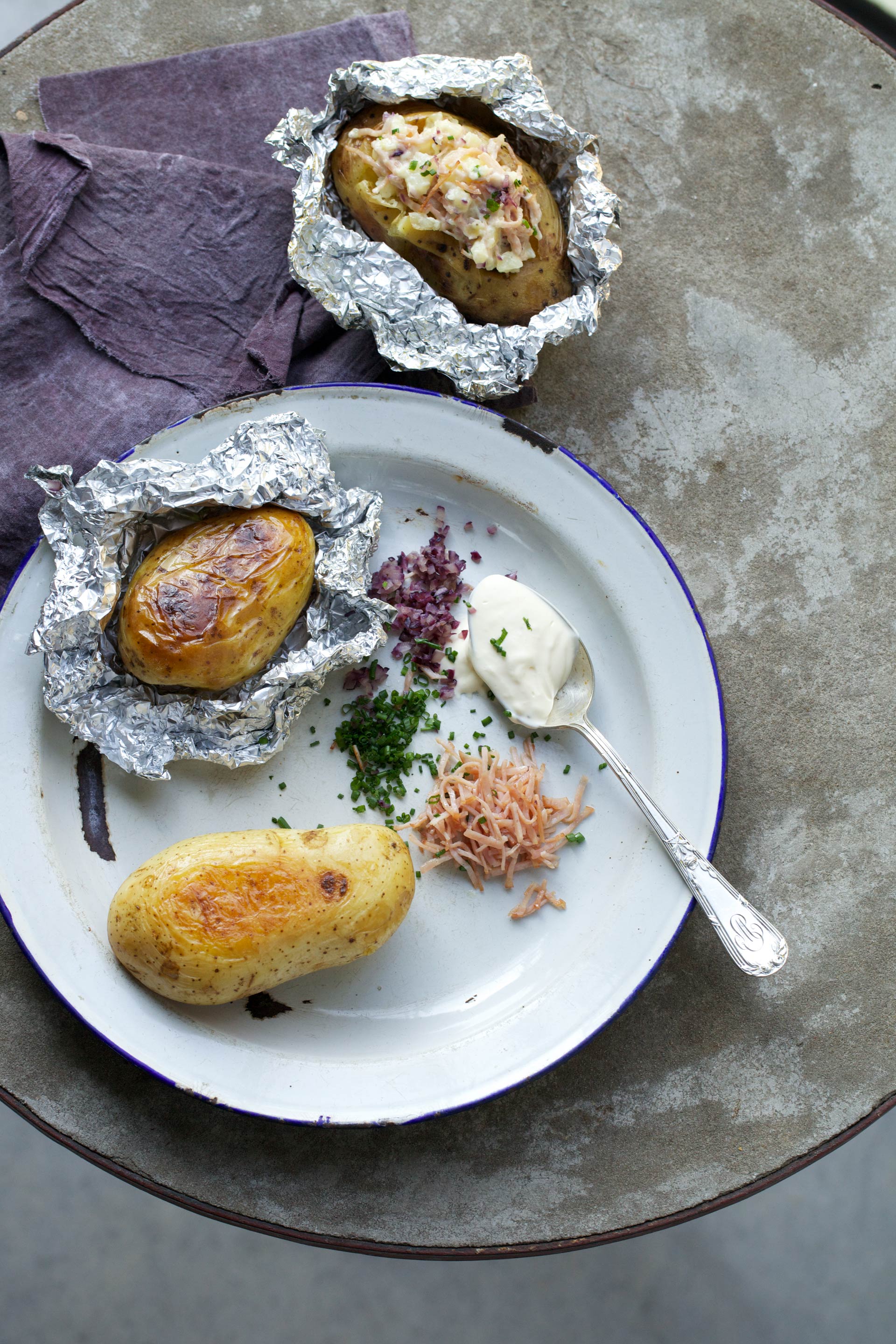 Aceitar y salar las papas. Envolverlas en papel aluminio y cocinarlas sobre una placa en horno medio hasta que estén tiernas (20 a 30 minutos aprox.).