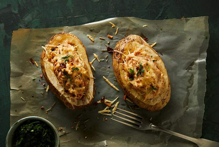 Con esta preparación rellenar las papas reservadas anteriormente y rallar por encima queso reggianito.
