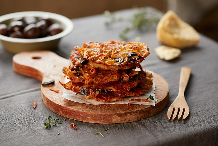Mezclar las papas ralladas con la Mayonesa Natura, el queso rallado, las aceitunas negras picadas y el tomillo fresco, salpimentar a gusto.