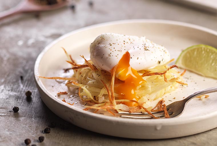 Colocar las papas en un plato y colocarles el huevo poché encima.