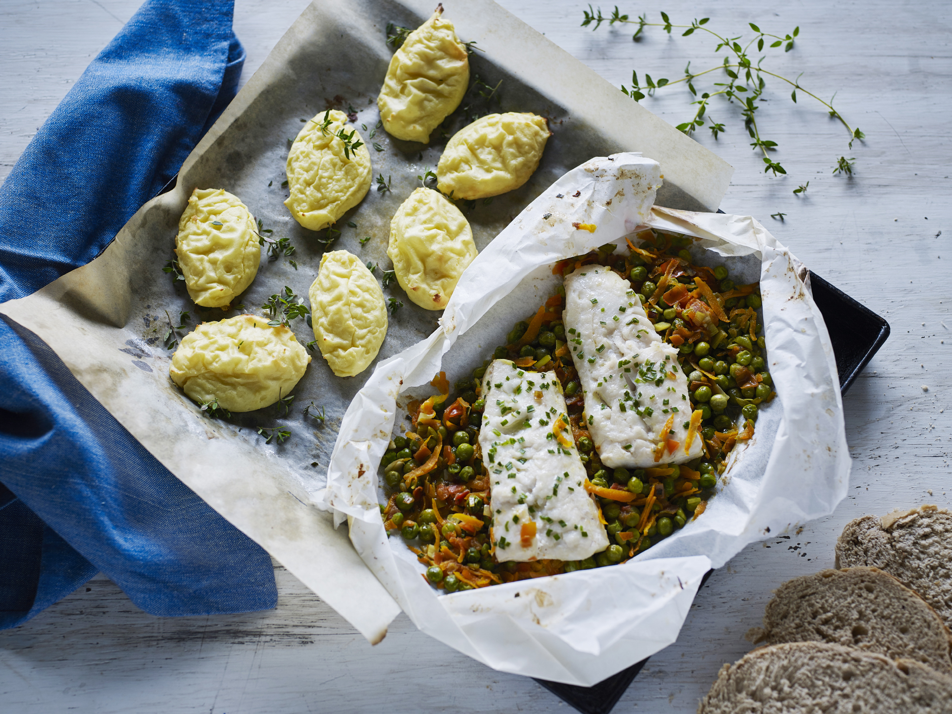 Papillotes de merluza con papitas duquesa