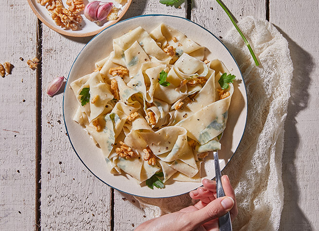En una sartén calentar a fuego bajo el Aceite de Oliva Selección Natura junto con la manteca y el ajo entero pelado, agregar las nueces picadas groseramente. Quitar del fuego, retirar los ajos y reservar caliente.