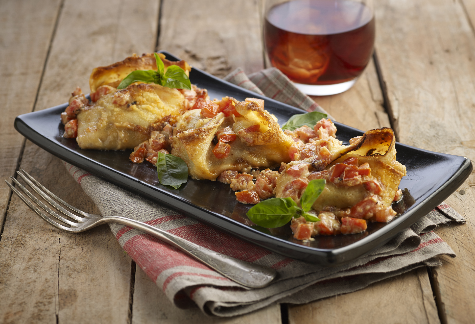 Servir los paquetitos bien calientes y decorar con unas hojas de albahaca fresca.