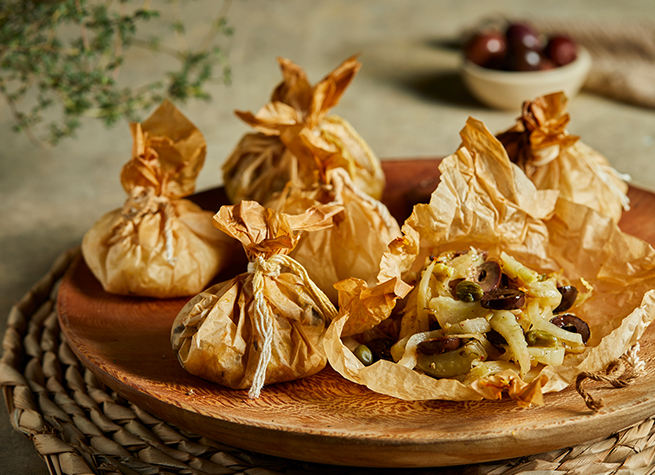 Lubricar una asadera con Rocío Vegetal Natura, colocar por encima los paquetitos y llevar a horno precalentado a 180 grados por aproximadamente 30 minutos.
