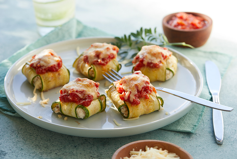 Colocar dos láminas de zucchini una sobre otra en forma de cruz, colocar en el centro una cucharada de relleno y cerrar el paquetito doblando las tiras hacia adentro. Disponer los paquetitos en una fuente apta para horno lubricada con Rocío Vegetal Natura Oliva, distribuir la salsa de tomate, espolvorearlos con mozzarella y luego con el queso rallado.