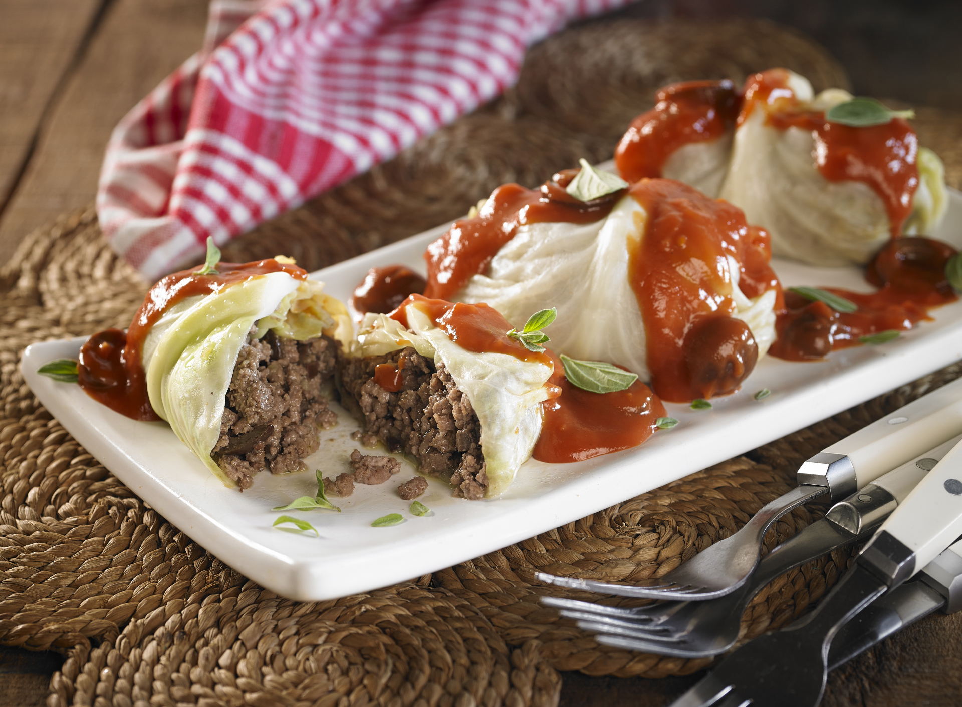 Blanquear las hojas de repollo en agua hirviendo con sal. Luego pasarlas por agua helada para cortar la cocción. Escurrir, colocar sobre papel absorbente y salpimentar.