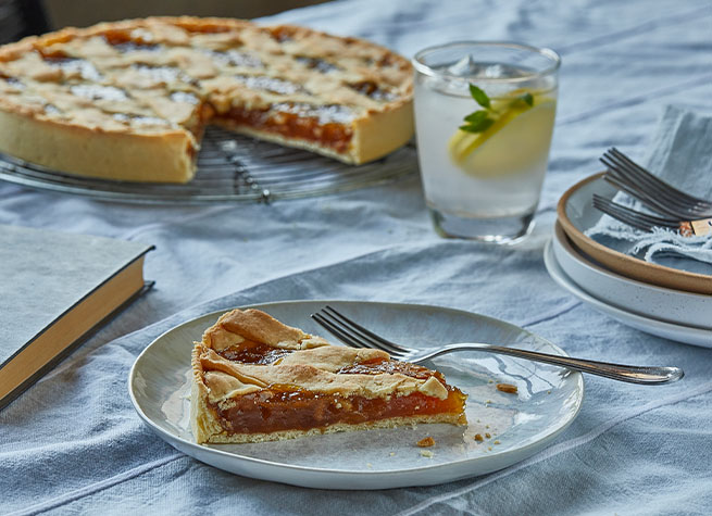 Decorar con tiras de masa formando el clásico cuadrillé de la pasta frola.