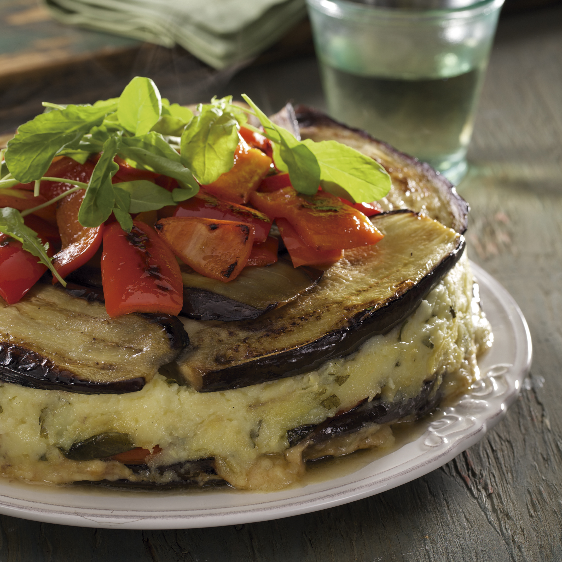 Cubrir las berenjenas con tomates cortados en rodajas bien finas, las hojas de albahaca y el puré de papas reservado. Finalizar con una capa de berenjenas. Acomodarlas en forma decorativa y tapar con papel de aluminio.