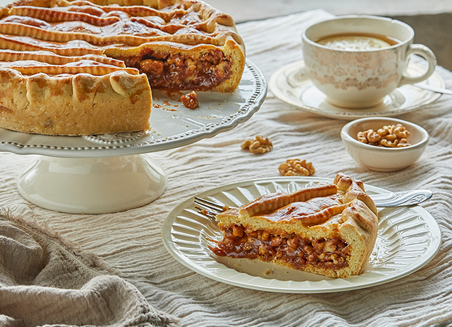 Espolvorear la mesada con harina, extender la mitad de la masa y darle forma circular con ayuda de un palo de amasar. Cubrir la base del molde reservado, cortar con un cuchillo los excesos del borde. Rellenar con la mezcla de nueces fría distribuyéndola de manera pareja.