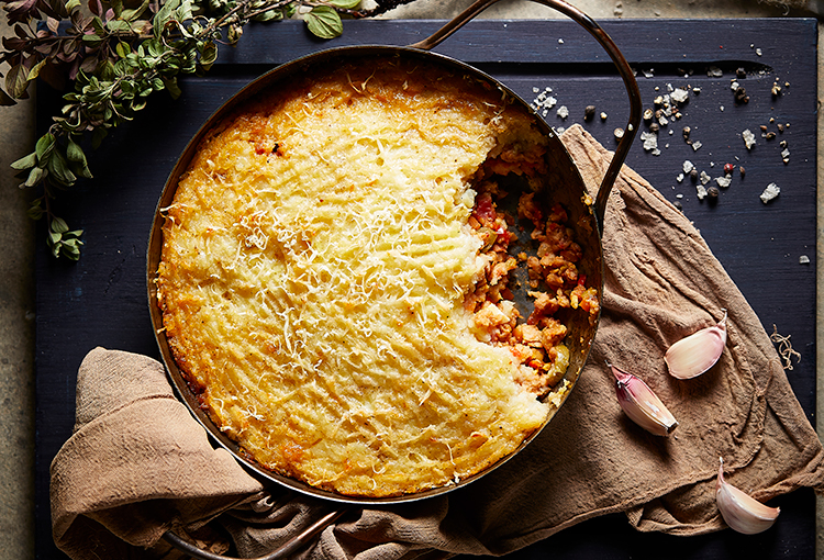 Cubrir el fondo de una fuente apta para horno con la soja, distribuir el puré de papas sobre la preparación. Llevar a horno caliente 20 minutos hasta que el puré se dore. Retirar y servir.
