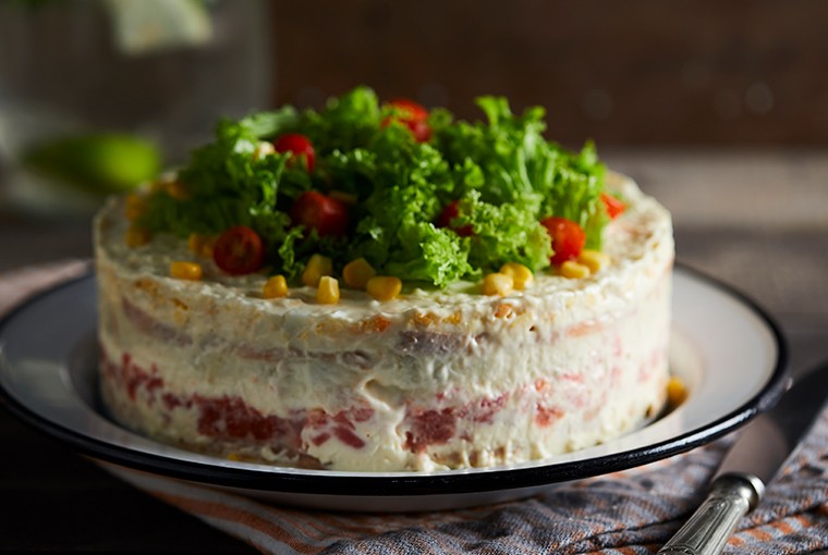 Para el armado del pastel, forrar la base de un molde desmontable 26 cm. con papel manteca y lubricarlo con Rocío Vegetal Natura. Distribuir sobre la base la mitad del puré y nivelar bien. Luego cubrir con una capa de Mayonesa Natura, continuar con otra de pechugas de pollo fileteadas finamente, continuar con una muy fina de Mayonesa Natura, otra con los tomates picados y de Mayonesa Natura, presionar bien. Cubrir con el resto del puré de papas nivelando el pastel, agregar otra capa fina de Mayonesa Natura, el resto del pollo fileteado, otra de Mayonesa Natura, otra con el huevo picado presionando bien con la ayuda de una cuchara y la última de Mayonesa Natura. Decorar con las hojas de lechuga, el choclo desgranado y los tomates cherry. Enfriar durante una hora en heladera, desmoldar con cuidado y servir.