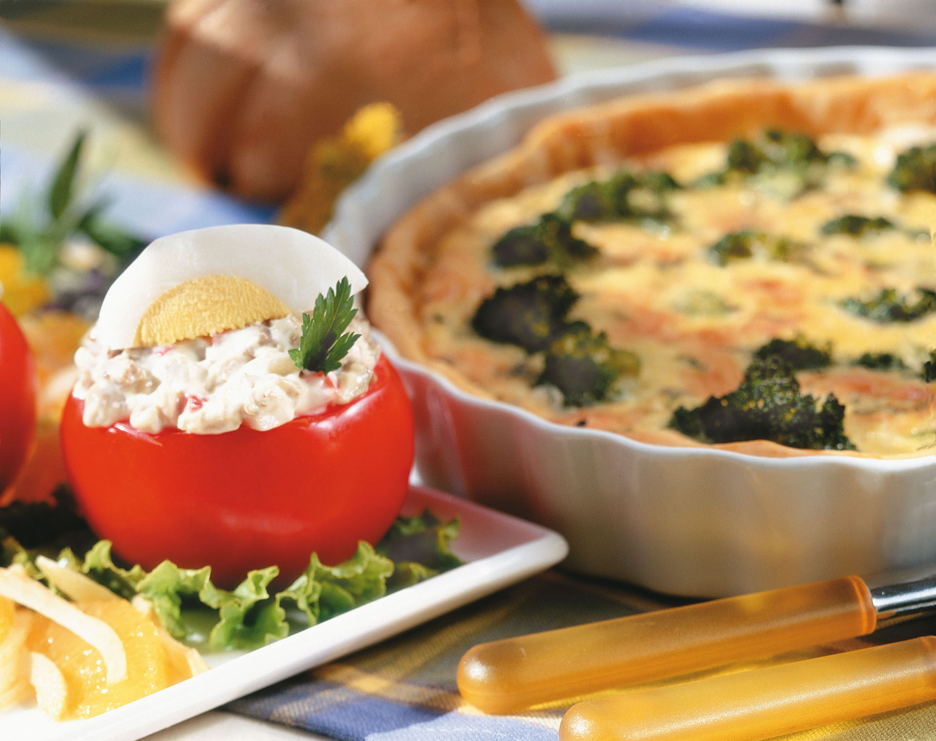 Cortar los huevos duros en cuartos, las cebollas en juliana y las aceitunas en tiritas. Sacar los gajos de las naranjas sin piel y sin hollejos y exprimir los esqueletos para sacar el jugo. Mezclar las cebollas con las aceitunas, los gajos y el jugo de naranja y condimentar con el Aceite Puro de Girasol Natura, sal y pimienta. Rellenar los tomates con el paté de berenjenas, sobre cada uno colocar ¼ de huevo duro y disponerlos sobre hojas de lechuga, acompañar con la ensalada de cebollas y aceitunas.