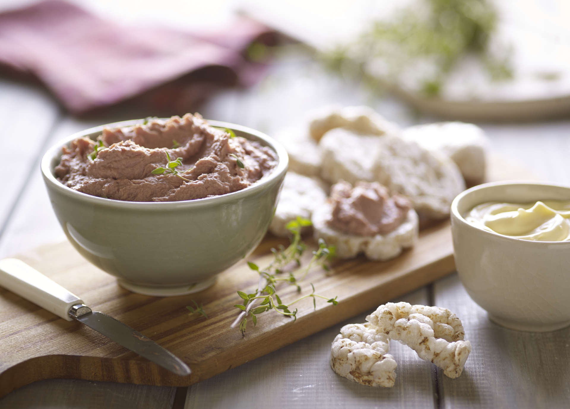 Cortar la cebolla en rodajas y colocar en una cacerola junto con el caldo y el hígado al que se le ha quitado previamente la telita que lo recubre. Condimentar con sal, pimienta y tomillo y dejar macerar durante 30 minutos. Luego llevar a fuego y cocinar hasta que el líquido se consuma y el hígado esté cocido. Retirar y colocar en la procesadora. Añadirle el queso crema y el Ketchup Natura. Colocar en un bowl y servir con mini galletas de arroz tostadas ligeramente en el horno. Acompañar si se desea con Mayonesa Natura.