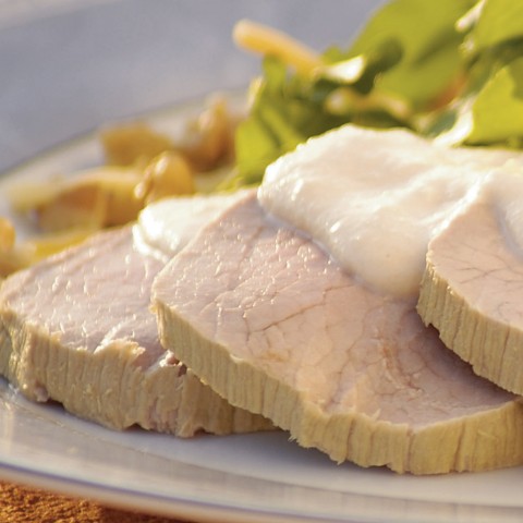 Cocinar el peceto en horno moderado de 50 a 55 minutos, dándolo vuelta dos veces durante su cocción y rociándolo con sus jugos. Cuando esté cocido dejarlo enfriar y cortarlo en rodajas finas. Acomodarlas en una fuente y colocar alrededor distintos recipientes con salsas: