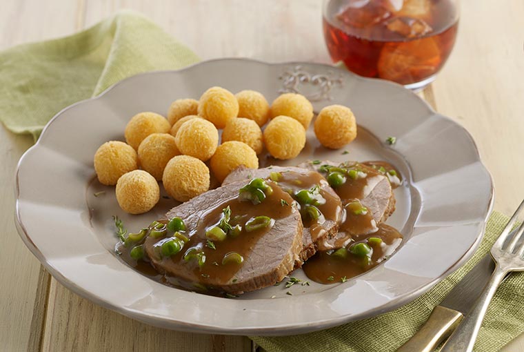 Unos minutos antes de terminar la cocción, agregar las arvejas -previamente hervidas- y el almidón de maíz disuelto en un pocillo de agua fría. Una vez que la salsa haya espesado, retirar las ramas de tomillo y servir la carne cortada en rodajas junto con la salsa salseado con acompañado de las papas.