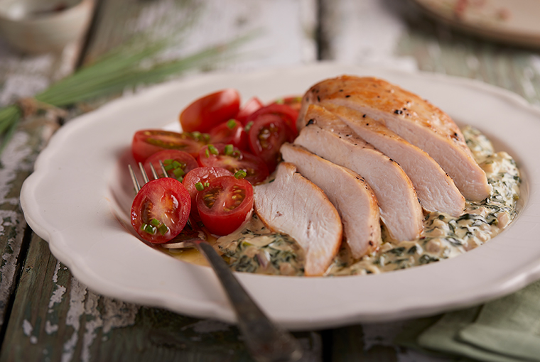 En el mismo fondo de cocción, rehogar los ajos y echalotes picados, agregar la espinaca picada, una pizca de nuez moscada y salpimentar a gusto. Agregar la crema de leche y la Mostaza Natura integrando bien. Apoyar las pechugas en la salsa de espinacas y continuar la cocción durante otros 10-15 minutos aproximadamente, a fuego lento revolviendo cada tanto. Servir las pechugas cubiertas con la salsa de espinacas.