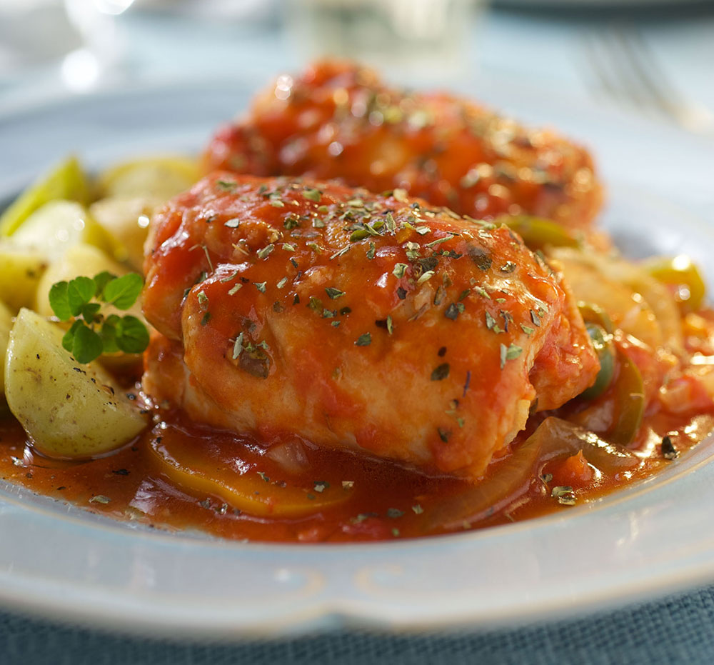 Lentamente incorporar los tomates algo triturados, cocinar a fuego moderado removiendo cada tanto hasta que llegue a ebullición y el tomate se reduzca considerablemente. Incorporar las presas de pollo, salpimentar y condimentar con orégano.