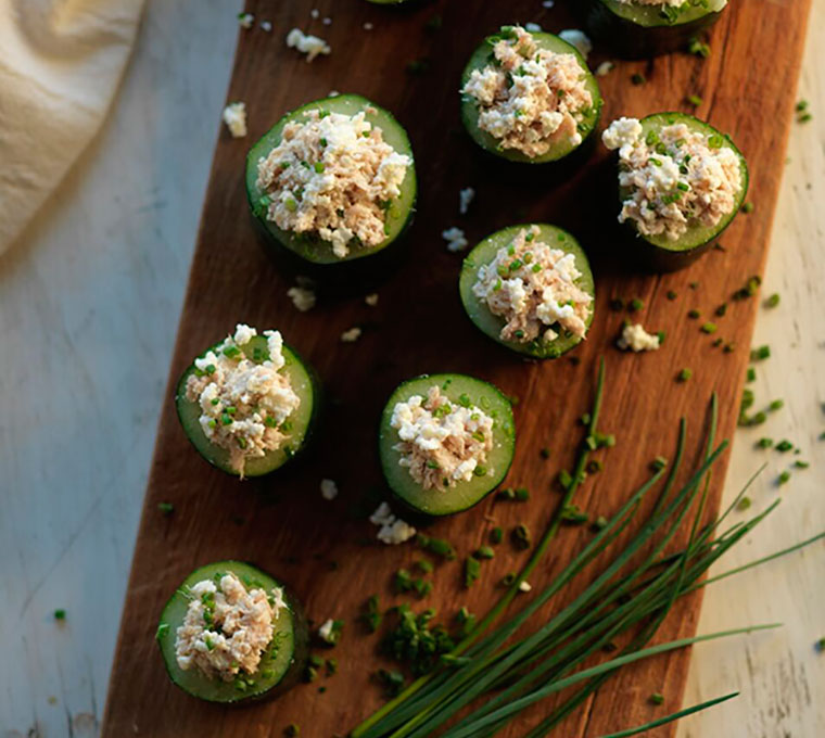 Aparte, en un bowl, mezclar el resto de los ingredientes. Rellenar los cuencos de pepino con la mezcla. Refrigerar durante una hora y espolvorear una pizca de paprika y ciboulette picado antes de servir.