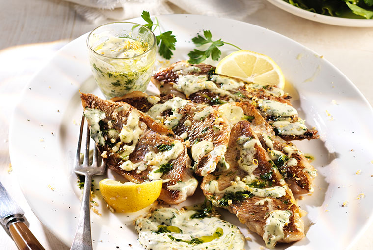 Pescado blanco con mayonesa especiada y guarnición