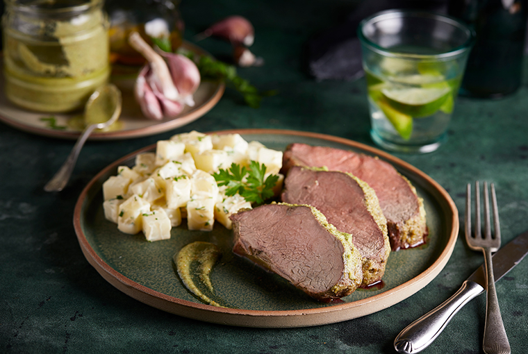 Picaña provenzal a la parrilla con papas y mayonesa al limón