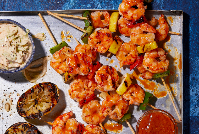 Retirar los camarones de la marinada reservando el líquido sobrante. Comenzar el armado pinchando alternadamente los morrones, el limón y los camarones cuidando que comiencen y terminen con morrón y queden cuatro camarones por pincho. Colocarlos en una fuente y pincelarlos repetidamente con la marinada reservada.