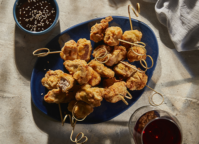 Pasado el tiempo de reposo de la carne, incorporar al bowl la harina y la fécula, mezclar y freír los cubos de cerdo enharinados, de a pocos a la vez, en abundante Aceite Puro de Girasol Natura. Una vez dorados, retirar con espumadera y disponer sobre papel absorbente de cocina.