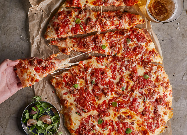 Luego, lubricar una pizzera con Rocío Vegetal Oliva Natura y estirar la masa, pintar con salsa de tomate y precocinar al horno por unos minutos. Retirar y reservar.