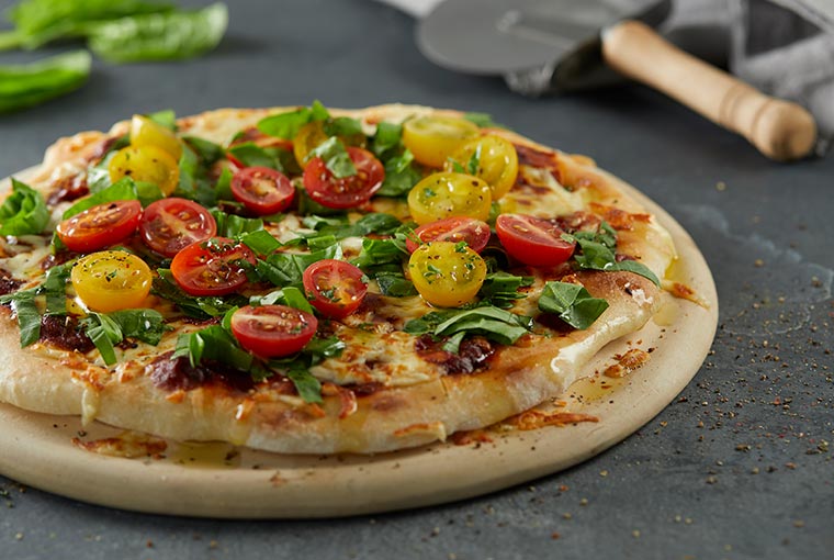 Retirar, colocar la pizza en una tabla de madera, espolvorear con las hojas de espinaca frescas, los tomates cherry al medio, una pizca de sal y un hilo de Aceite de Oliva Selección Natura. Servir inmediatamente.