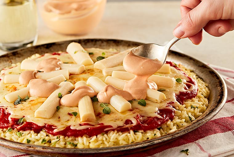 Cocinar en horno moderado durante 20-25 minutos, retirar, agregar los palmitos en rodajas y decorar con la Salsa Golf Natura. Servir.