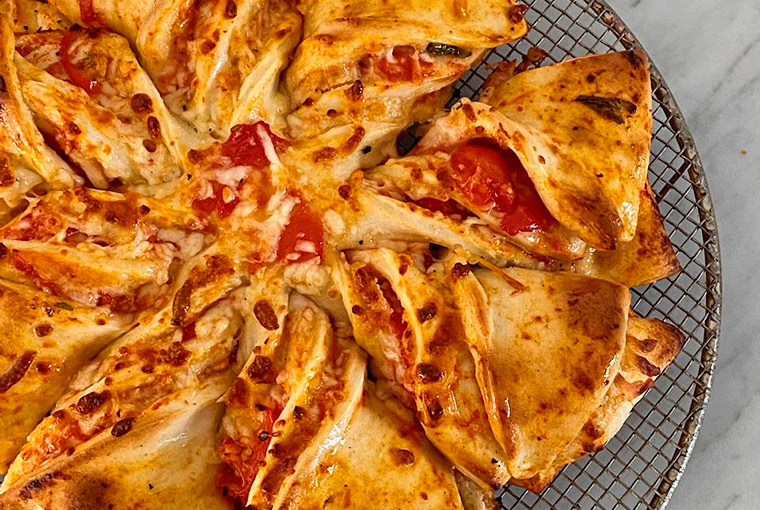 Con un cuchillo realizar cortes secos y formar triángulos, dejando el centro sin cortar. Por último tomar cada triángulo, torzarlo con cuidado y volverlo a apoyar en la placa. Pincelar la pizza estrella con Aceite de Oliva Selección Natura y hornear a 180/200°C hasta que esté bien cocida, retirar y pincelar nuevamente con Aceite de Oliva Selección Natura perfumado con ajo a gusto.