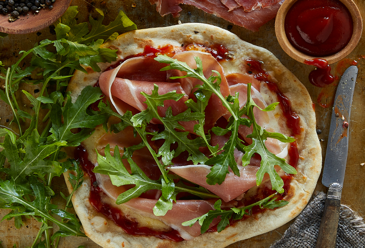 Calentar una sartén lubricada con Rocío Vegetal Oliva Natura a fuego medio, colocar la pizzeta y cocinar durante 6 minutos, girarla y cubrirla con el Ketchup Natura y la mozzarella, tapar la sartén y cocinar hasta que se funda el queso. Retirar, cubrir con el jamón crudo, la rúcula y un hilo de Aceite Natura Oliva Virgen Extra Selección.