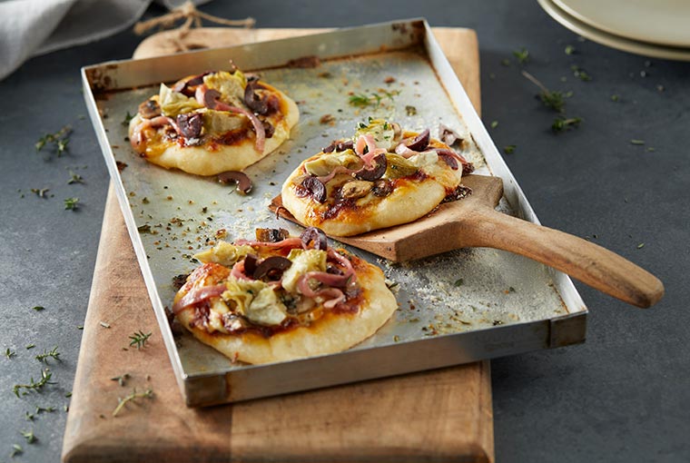 Para el armado de las pizzetas, colocar sobre cada una la salsa de tomate y llevar a horno fuerte precalentado durante 15-18 minutos hasta que la base esté dorada. Retirar, rellenar con un puñado de mozzarella, alcauciles, champiñones, jamón cocido, aceitunas negras y llevar a horno hasta fundir el queso.