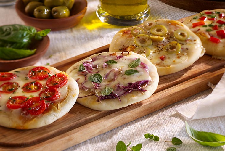 Pintar las pizzetas con la salsa de tomate y llevar a horno medio hasta que la masa este seca en el piso y dorada por arriba. Agregarle el queso mozzarella y llevar unos minutos más al horno hasta que se derrita del todo. Una vez que las pizzetas estén listas, retirarlas, esparcirles algunas aceitunas por arriba y rociar con un poco de Aceite de Oliva Natura.