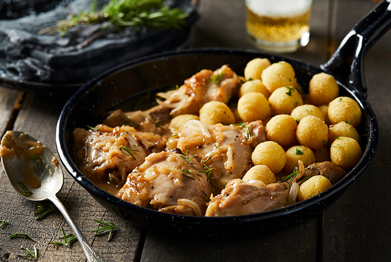 Enharinar las patas de pollo, sellarlas de ambos lados en una sartén con un hilo de Aceite Blend Natura. Agregar la cebolla pelada y cortada en aros, unas ramitas de romero, sal y pimienta a gusto. Por último, agregar la cerveza, mezclando para distribuir bien el líquido entre los ingredientes. Cocinar a fuego suave cubierto durante unos 40 minutos, a mitad de cocción, agregar, de ser necesario, un poco de agua caliente o cerveza con el fin que el fondo de cocción no se seque. Retirar y servir las patas de pollo bañadas con la salsa a la cerveza y las papas noisette cocidas al horno con un hilo de Aceite Blend Natura, sal y ramitas de romero.