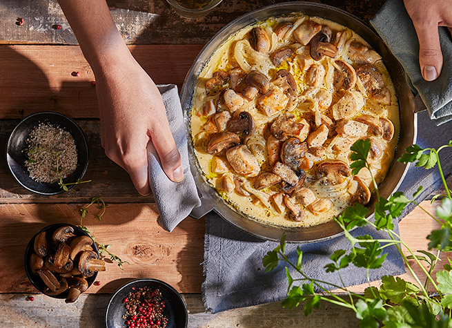 Calentar el Aceite Puro de Girasol Natura con la mitad de la manteca y rehogar la cebolla y el ajo picado a fuego bajo, durante 10 minutos. Agregar las pechugas cortadas en cubos y sellar de todos sus lados, salpimentar. Incorporar los champiñones limpios y cortados a la mitad, y cocinar durante 5 minutos integrando bien. Luego, agregar el vino blanco y cocinar a fuego suave.