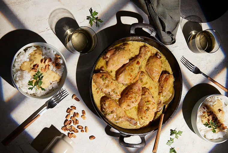 Servir las presas de pollo sobre un colchón de arroz blanco rociado con abundante salsa de mostaza y maní.