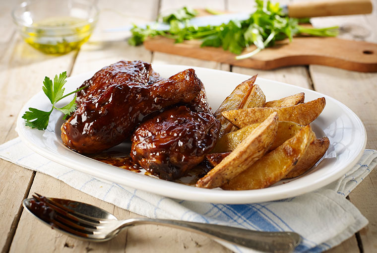 Servir el pollo acompañado de la salsa barbacoa y las papas.