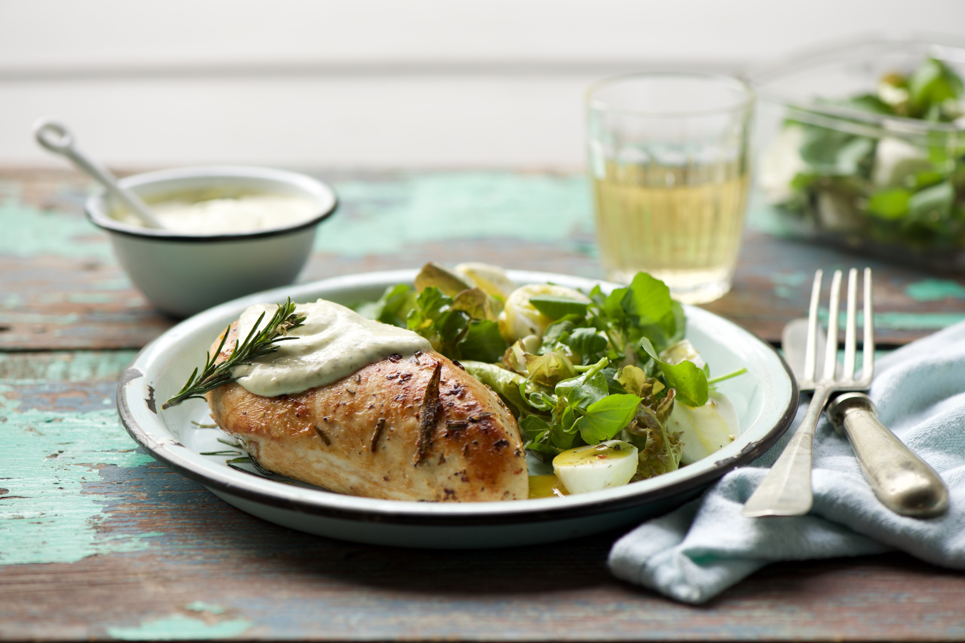 Pollo en salsa de alcaparras con mix de verdes y bocconcini