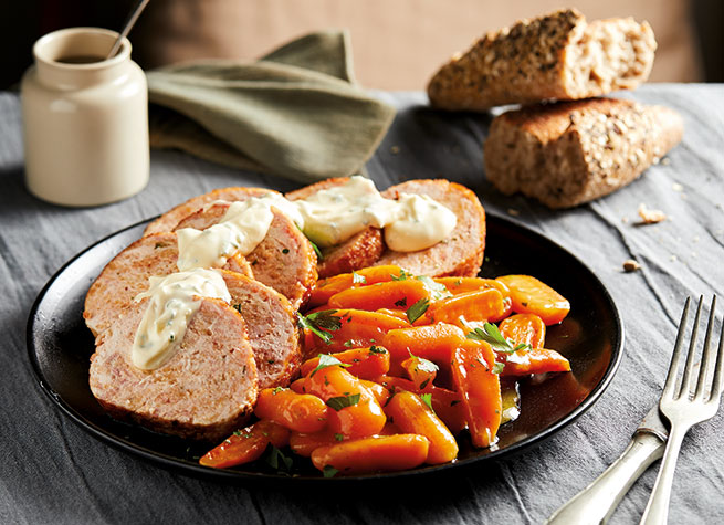 Una vez que el polpettone esté listo, retirar y servirlo en fetas. Verter por encima la salsa de Mayonesa Natura. Acompañar con las zanahorias glaseadas.